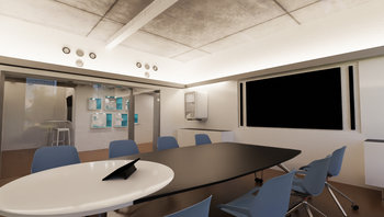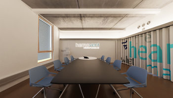 Für den Konferenzraum entwarf Bloom ein repräsentatives und zugleich funktionales Raum-Konzept – mit einer Mediawand und einem skalierbaren Besprechungstisch für hybride und klassische Meetings sowie eine neu eingezogene große Glaswand für angenehme Transparenz. Ein im Corporate Design gestalteter Vorhang ist als Sicht- und Schallschutz-Element vorgesehen – falls einmal eine konzentrierte und vertrauliche Arbeitsatmosphäre gewünscht ist. So entstand bei Bloom ein Corporate-Building-Konzept aus einem Guss, das in jedem Detail die Marke Hemovent™ widerspiegelt.