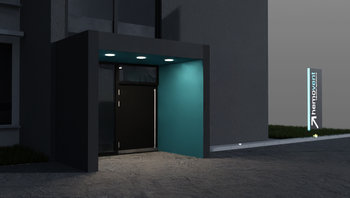 Äußerst stilvoll: Ein großer Metallpylon mit hinterleuchtetem Markenlogo heißt den Besucher im Außenbereich zukünftig willkommen und führt ihn intuitiv zum Haupteingang, der durch ein neu gestaltetes Vordach repräsentativ und zugleich funktional aufgewertet wird.