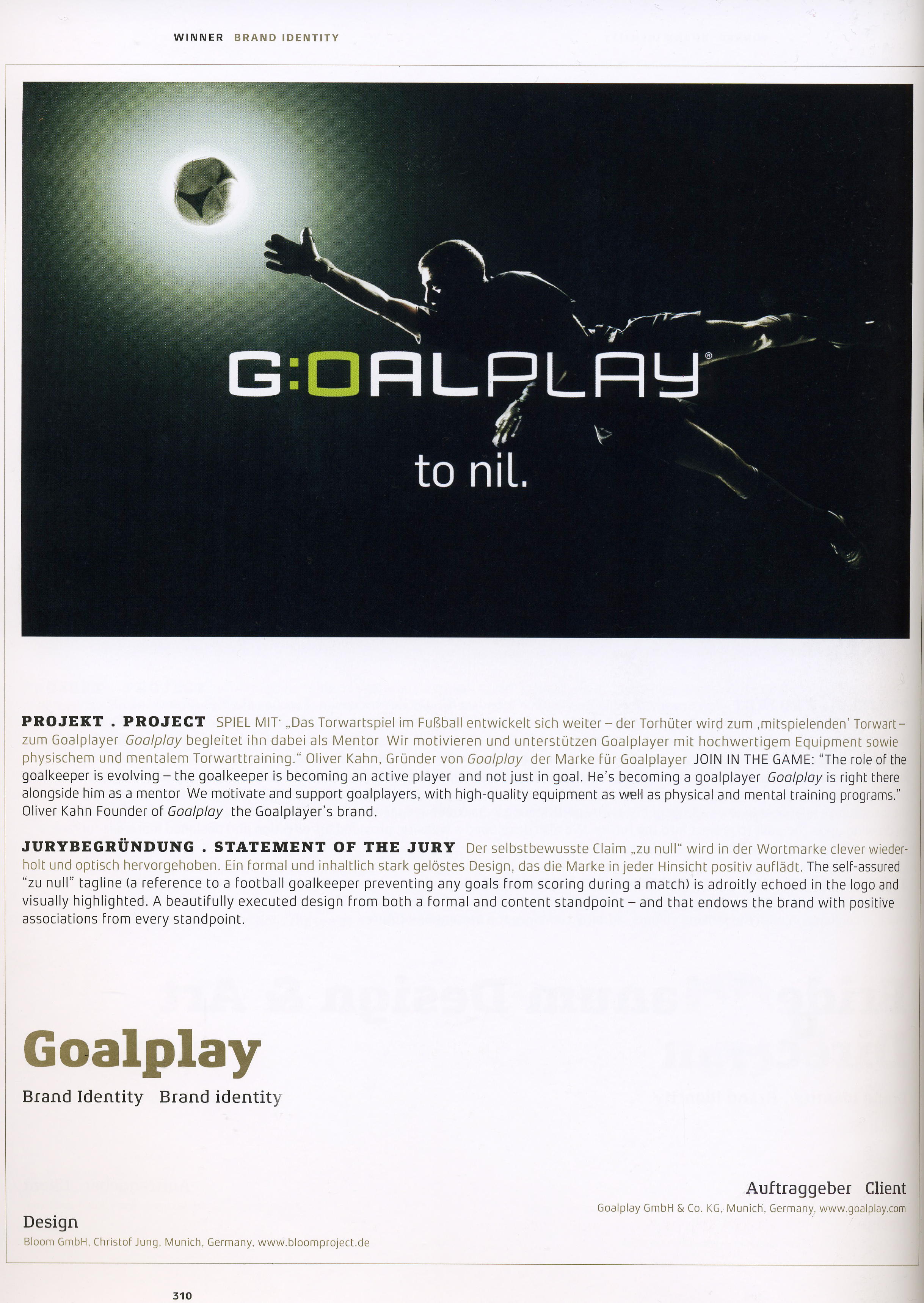 „Der moderne Fußballtorwart ist Torhüter und Feldspieler zugleich. Er ist Torspieler, eben ein Goalplayer, und braucht speziell auf seine Bedürfnisse zugeschnittene Angebote“, erklärt Oliver Kahn. „Die Kreativagentur Bloom hat genau verstanden, was wichtig ist und es mit dem neuen Markenauftritt ideal umgesetzt.“