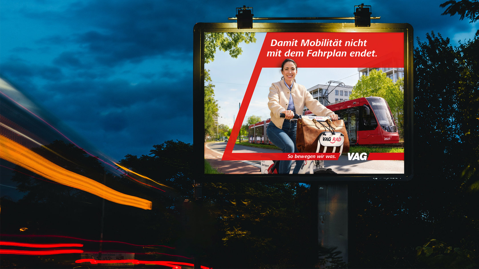 Die Motive sprechen Nutzer*innen wie auch Nicht-Nutzer*innen spezifisch an. Im Mittelpunkt stehen reale Situationen und Menschen: von der Tram über U-Bahn und Bus bis zum VAG_Rad, von Pendelnden bis zur Skaterin. Die ÖPNV-Nutzer*innen werden zu Protagonist*innen, die den persönlichen Nutzen der VAG dramatisieren. Fotografiert wurde an echten Locations in Nürnberg, teilweise im laufenden Fahrbetrieb. Neben professionellen Models standen auch Laienmodels aus der Region vor der Kamera. So entstand eine authentische Bildwelt, die den Alltag im Nürnberger ÖPNV real und unmittelbar erlebbar macht.