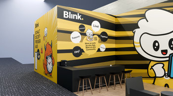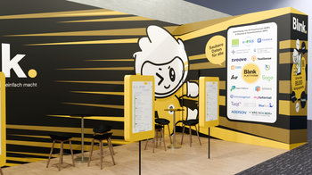 Die besondere Herausforderung: Erstmals bespielt Blink auf der CMS zwei Standflächen, die räumlich durch einen Eingang getrennt sind. Bloom löste dies mit einer starken architektonischen Idee: Die bekannte Blink-Sonne wurde zum verbindenden Mittelpunkt, ergänzt durch ein symmetrisches Linienspiel, das beide Flächen zu einem großen Ganzen verschmilzt.