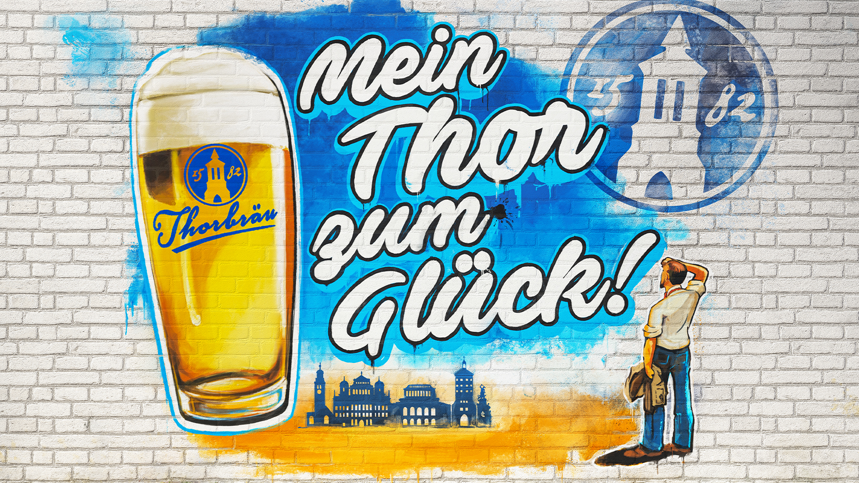 Viele Inhaber von kleinen und mittelständigen Unternehmen wären der Meinung, damit seien die Hausaufgaben gemacht. Nicht so Max Kuhnle, der Vater der Thorbräu Biere. Mit seiner Marke Thorbräu wollte er offensiv nach außen gehen und dabei ungewöhnlich auftreten. Da kam er bei Bloom genau an die Richtigen. Ausgehend von unserer Positionierung wurde im nächsten Schritt die Markenkommunikation abgeleitet. Adressiert an die junge Zielgruppe, die den kleinen lokalen Bieren mehr und mehr den Vorzug gibt, entwickelte Bloom ein Keyvisual im auffälligen Graffiti-Style. Die Headline „Mein Thor zum Glück“ nutzt den Markennamen für ein starkes Produktversprechen. Die visuelle Übersetzung dafür ist ein dürstender Mann vor der Augsburger Stadtsilhouette und ein überdimensionales Bierglas, das wie eine Verheißung über allem schwebt. Der Claim „Thorbräu. In Augsburg daheim“ betont die Herkunft und schafft Identität mit der Stadt und seinen Bürgern.