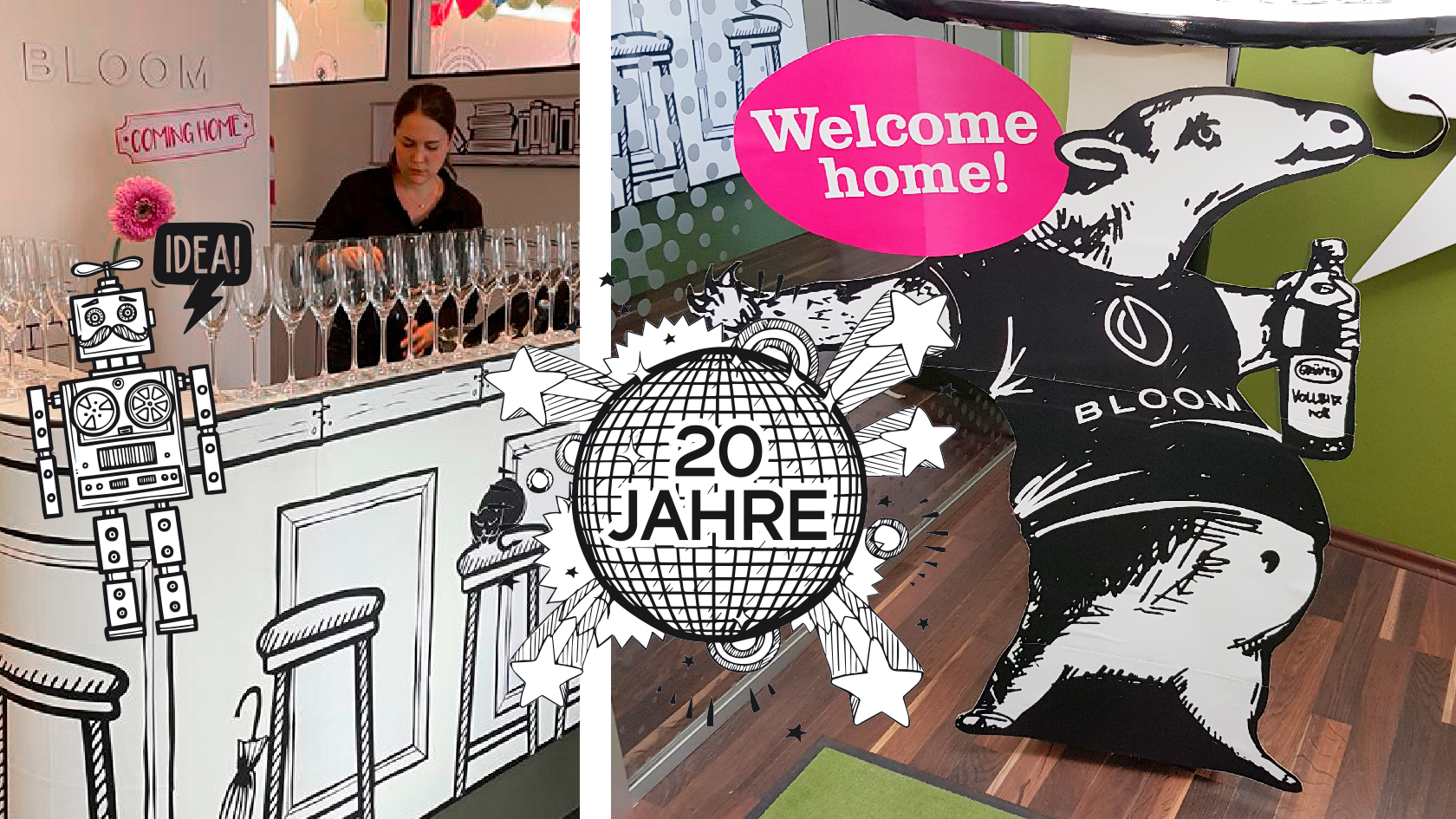 Im vierten Stock angekommen, betraten die Gäste eine einzigartige Umgebung wie aus einer Comic-Welt. Die gestalterische Idee hinter dem Party-Motto „Coming home“ war es, aus der Agentur ein kreatives Wohnzimmer zu machen. Im Mittelpunkt der Party sollten die Menschen und ihre einmalige Zeit in der Ajtoschstraße 6 stehen. Die Bloom-Mitarbeiter verwandelten die Möbel und zahlreiche Flächen: Sie kreierten mit viel Aufwand einen durchgängigen und humorvollen Comic-Look in Schwarz-Weiß. Bei einem Gläschen und einem guten Gespräch mit (ehemaligen) Kollegen konnten die Gäste viel in den Räumlichkeiten innen, aber auch von außen auf der Terrasse entdecken: So sah man etwa einen heimeligen Comic-Kamin im Konferenzraum und ein Comic-Lama schaute aus dem Fenster. Selbst im entlegensten Winkel der Agentur fand man kleine gezeichnete Figuren.