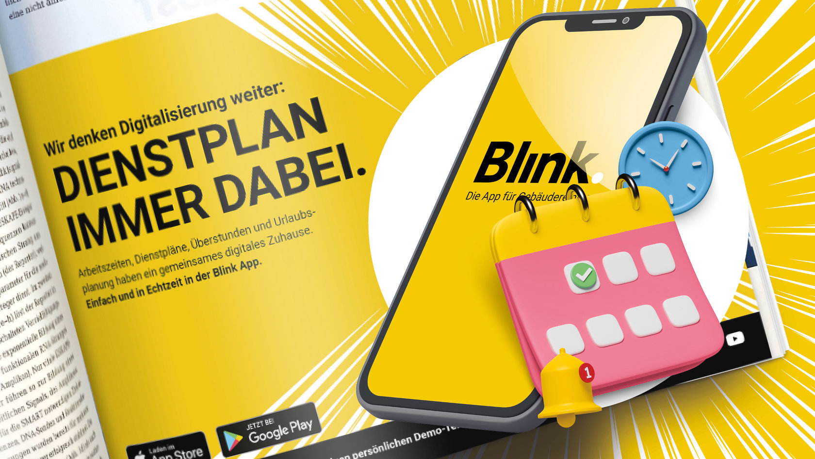 Blink versteht sich als Frontrunner, der die Digitalisierung der Gebäudereiniger-Branche maßgeblich vorantreibt. Die Blink App macht es möglich, alle wesentlichen Workflows wie Zeiterfassung, Dienstplanung, Materialbestellung und mehr zentral zu vereinfachen. Als Kür kommen regelmäßig weitere Funktionen hinzu. In einer neu konzipierten Anzeigenserie kommuniziert Bloom daher eine zentrale Botschaft an die Brancheninsider: Wir denken Digitalisierung weiter.