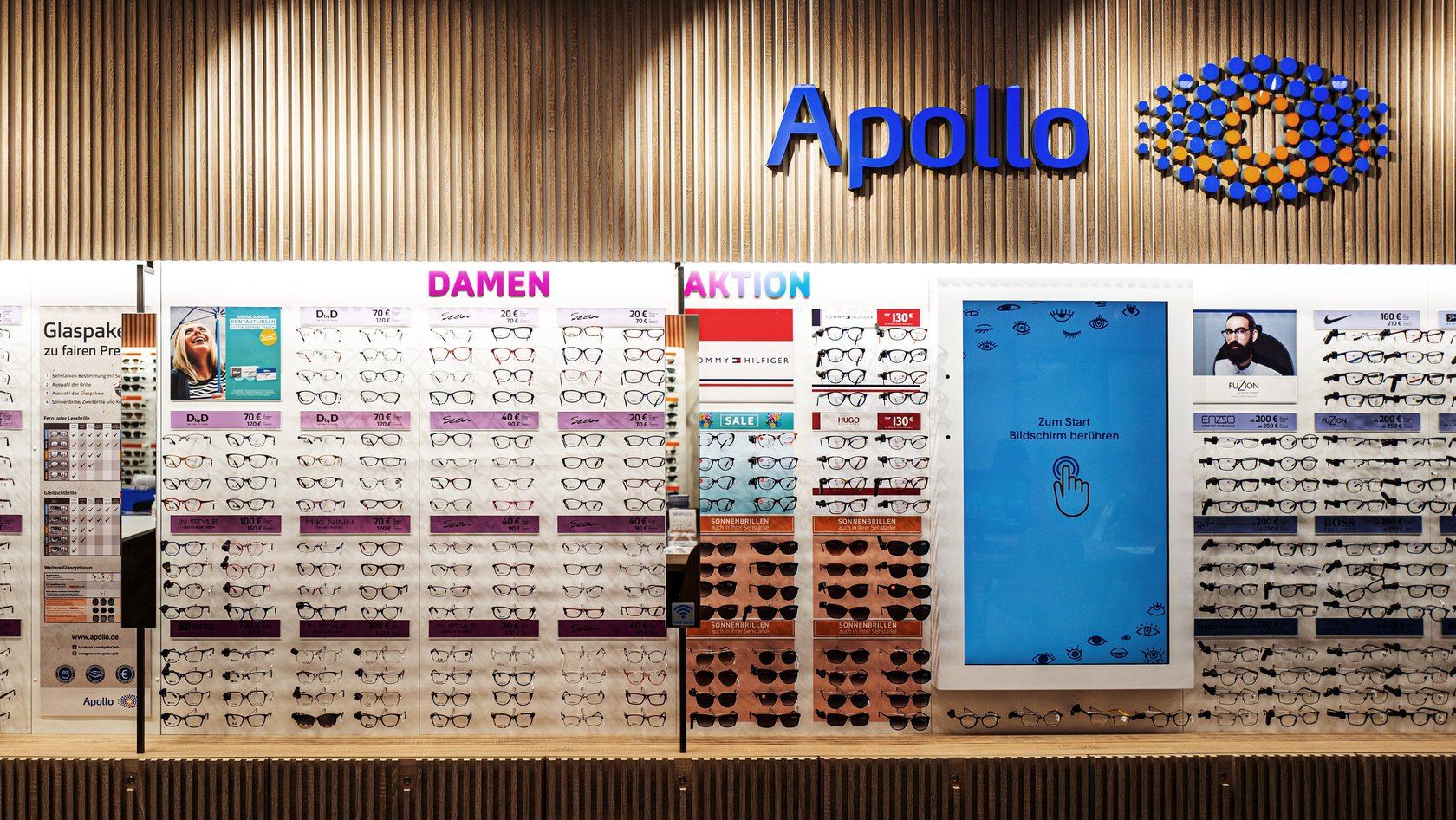 Passend zum stylischen innenarchitektonischen Konzept mit viel Holz und Beton entwickelte die Kommunikationsagentur Bloom Nürnberg das Farbkonzept für das POS-Mobiliar und für diverse POS-Werbemittel. Neben der ästhetischen Wirkung hat die Farbgebung dabei die Funktion eines Leitsystems. Aufeinander abgestimmte Colour Codes auf Basis der Apollo CD-Farben und Sortimentsbezeichnungen in 3-D-Schrift ermöglichen es den Kunden, sich schnell im Brillenregal zurechtzufinden. Auch die weiteren Sortimente wie Kontaktlinsen, Hörgeräte oder Aktionsware sind farblich und mit Schriftzügen klar gekennzeichnet.