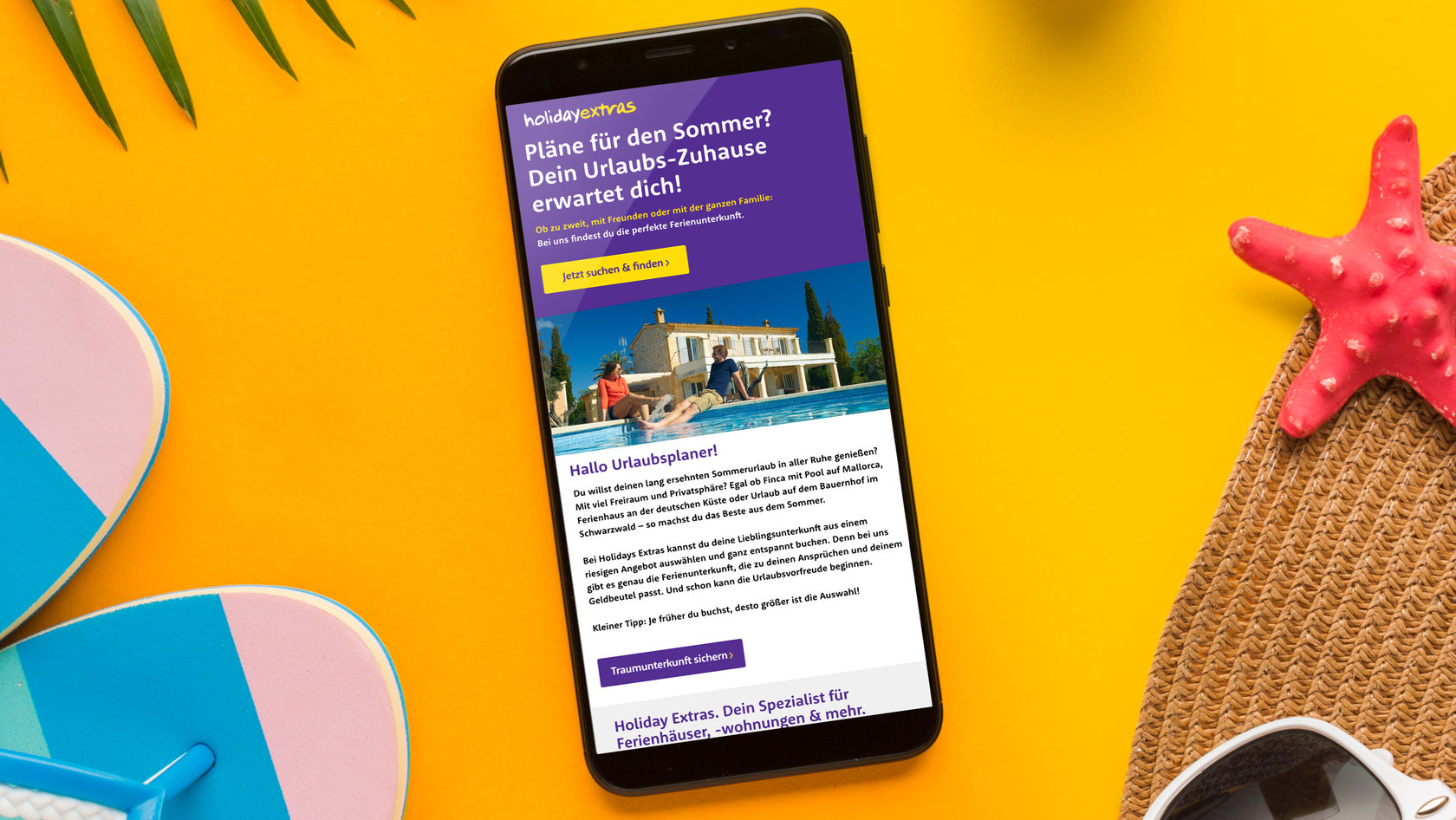 Um den Newsletter-Abonnenten das noch relativ neue und weitgehend unbekannte Thema „Ferienunterkünfte“ nahezubringen, entwickelte und programmierte Bloom Nürnberg einen weiteren Neuprodukt-Newsletter. Dieser richtet sich an alle Urlaubshungrigen, die im Sommer 2021 eine Ferienunterkunft mit viel Freiraum und Privatsphäre suchen. Vom Ferienhaus bis zum Bauernhof – bei einer Auswahl von 1,2 Mio. Unterkünften hat Holiday Extras für jeden das passende Urlaubs-Zuhause.