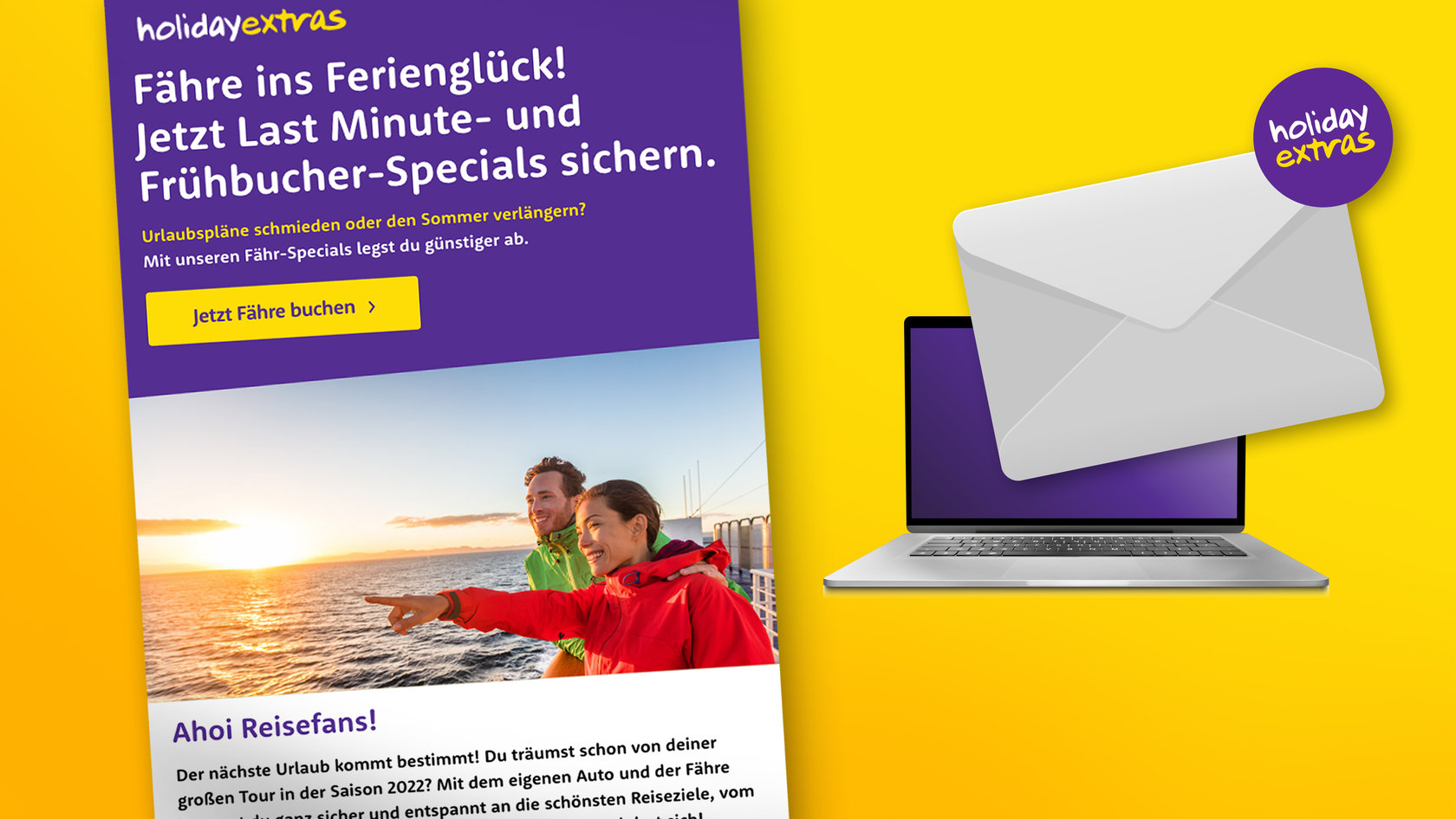 Holiday Extras startete 2003 als Spezialist für Parkplätze und Hotels an Flug- und Fährhäfen auf dem deutschen Markt. Inzwischen hat sich das Münchner Unternehmen zum Rundum-Anbieter von Reise-Extras gemausert. Neben Lounges, Transfers und Mietwagen, kamen während der Pandemie Reiseversicherungen, Aktivitäten und nun auch Fähren hinzu. Um das neue Produkt bei den bestehenden Kunden bekannt zu machen, entwickelte Bloom Nürnberg einen Newsletter, der Lust auf Verreisen mit Pkw und Fähre in zwei unterschiedlichen Reisezeiträumen machen soll.
