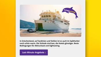 Zum einen werden die Last-Minute-Bucher angesprochen, die spontan den Sommer verlängern und in südlichen Gefilden noch mal Sonne tanken wollen. Zum anderen richtet sich der Newsletter an alle Reiselustigen, die langfristig den nächsten Frühjahrs- oder Sommerurlaub planen und sich Frühbucher-Vorteile sichern möchten. Ziel des Newsletters ist es, beiden Reisetypen die passenden Fähr-Specials zu unterbreiten und möglichst direkt zum Buchen zu animieren.