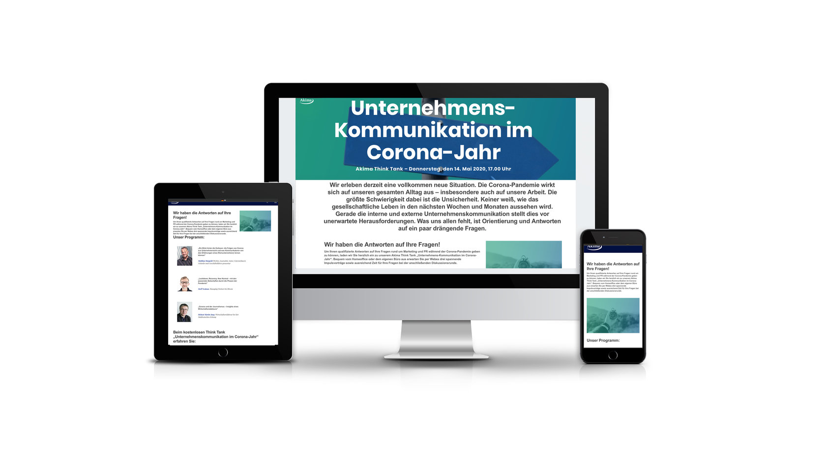 Kostenloser Akima Think Tank „Unternehmenskommunikation im Corona-Jahr“ am Donnerstag, den 14. Mai 2020, 17.00 Uhr. Bequem vom Homeoffice oder dem eigenen Büro aus erwarten Euch per Webex drei spannende Impulsvorträge à 20 Minuten sowie ausreichend Zeit für Eure Fragen bei der anschließenden Diskussionsrunde.