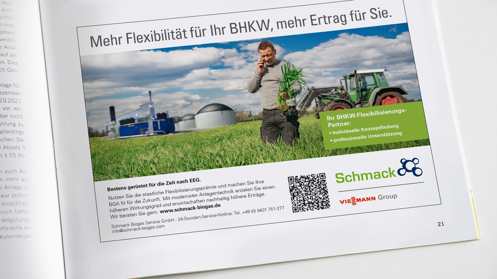 Der zur Viessmann Climate Solutions SE gehörige Biogas-Pionier Schmack leistet dabei tatkräftige Unterstützung – und begleitet den Wandel in der Branche bereits über mehrere Jahre hinweg mit einer langfristig angelegten Anzeigenkampagne. Die von Bloom Nürnberg entwickelte Kampagne profiliert die Schmack Biogas Service GmbH als kompetenten und zuverlässigen Partner, der die Anlagen der Betreiber fit macht für die Zukunft – und so den wirtschaftlichen Betrieb sicherstellt.