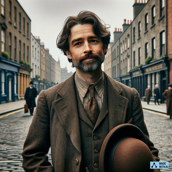 "A middle-aged man in his late thirties, average in build, walking in early 20th-century Dublin. He has a slightly unkempt beard and hair, and a reflective expression with realistic eyes. Dressed in a modest, period suit, slightly worn, with a shirt and simple tie. He's holding a bowler hat and a newspaper, with Dublin's historical architecture and cobblestone streets in the background. The colors are muted, with an emphasis on browns, greys, and dark greens, creating a thoughtful and historical atmosphere."