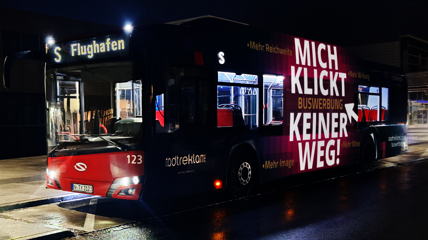 Wichtig für das kreative Konzept von Bloom ist das Wissen, dass Außenwerbung im digitalen Zeitalter einen unschlagbaren Vorteil bietet: Sie ist unübersehbar und fester Bestandteil des Stadtbildes. Insbesondere Werbung auf Bussen kann man einfach nicht übersehen – und erst recht nicht wegklicken. So bringt es Bloom prägnant auf den Punkt: „Mich klickt keiner weg!“ Diese plakative und enorm selbstbewusste Botschaft auf dem Bus ergänzt die Kreativagentur durch die Mehrwerte für die Werbetreibenden: „Mehr Reichweite, mehr Wirkung, mehr Image, mehr Wow“