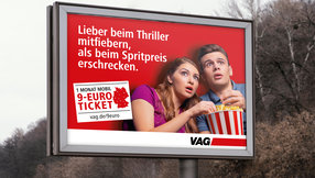 Die Kampagne der VAG war von Anfang an so konzipiert, dass man das Thema 9-Euro-Ticket perfekt integrieren konnte: Und so gab es zum Verkaufsstart über Nacht ein Update der Großflächen im Raum Nürnberg inkl. der URL vag.de/9euro für alle weiteren Infos. Bei den Infoscreens und im Fahrgast-TV erfolgte ebenso eine Aktualisierung. Jedes Motiv unterstreicht nun einen eigenen Mehrwert des 9-Euro-Tickets (Spar-Effekt, Umweltschutz, deutschlandweite Mobilität und die Vorteile für Abo-Kunden). Insofern ist die VAG-Kampagne in Kombination mit dem 9-Euro-Ticket ein starker Anreiz, langfristig den ÖPNV zu nutzen.