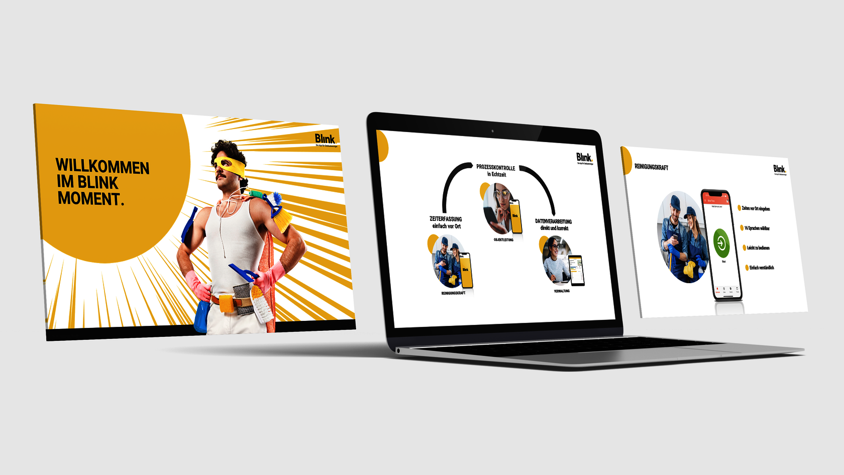 Nach Webseitenrelaunch und Anzeigenkampagne haben sich Blink - die App für Gebäudereiniger und BLOOM Nürnberg den nächsten Corporate-Design-Baustein vorgenommen: die formale und inhaltliche Anpassung der Vertriebspräsentation an den neuen Blink Markenauftritt.