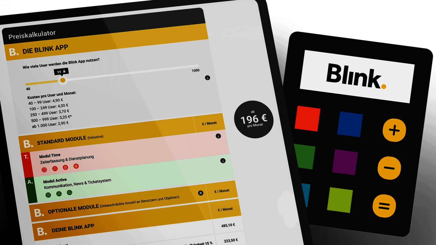Jetzt zündete das Blink-Bloom-Powerteam die nächste Informationsstufe: Ein neues Produktmotiv im Look der Imagekampagne, ein Produktguide sowie ein interaktiver Preiskalkulator stellen die Funktionen und Vorteile der App auf der Webseite komprimiert heraus.